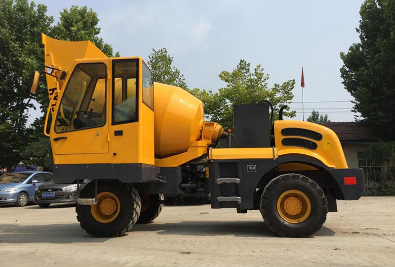 The mixer is composed of chassis, transmission system, hydraulic system, frame, mixing tank, charging and discharging device, water supply system, operating system, human ladder etc.. The front end of the mixing tank is connected and installed with the reducer on the front of the frame, and the back end is supported by two riding wheels installed in the back of the frame.