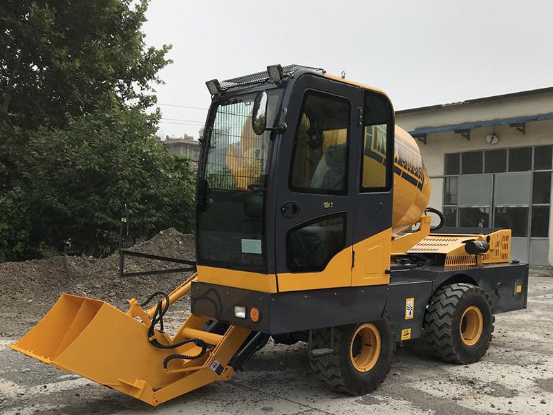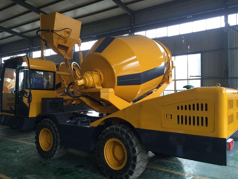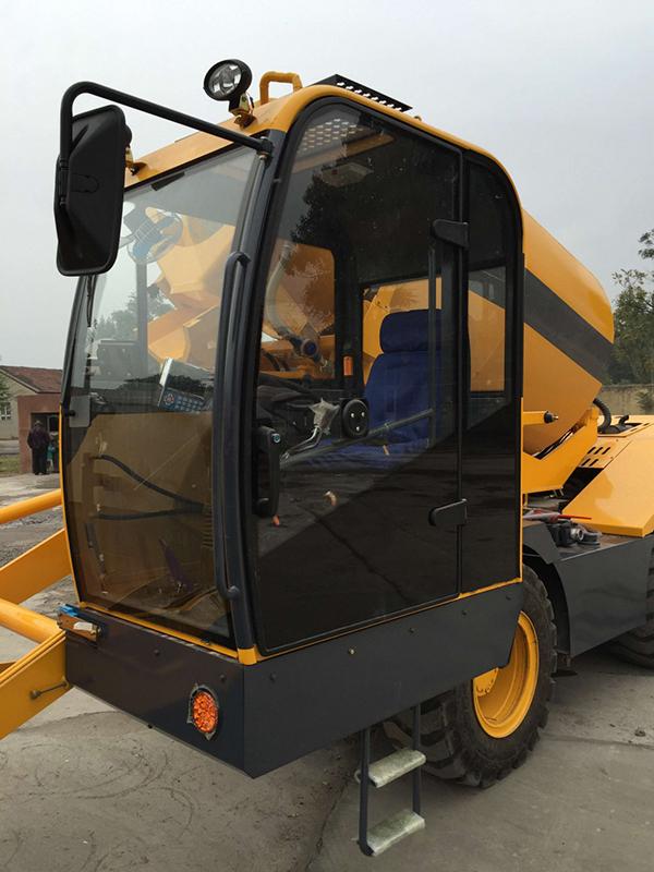 The mixer consists of chassis, transmission system, hydraulic system, frame, mixing tank, charging and discharging device, water supply system, operating system, human ladder etc.. The front end of the mixing tank is connected and installed with the reducer on the front of the frame, and the back end is supported by two riding wheels installed in the back of the frame.